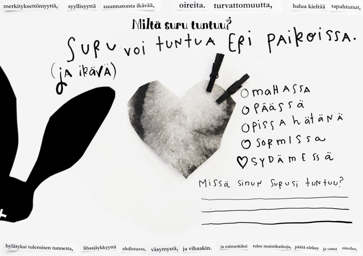 Joskus suru tuntuu kuplalta ympärillä. Siltä, että kukaan ei ymmärrä tai siltä, että miten ihmeessä muu maailma voi vain jatkaa kulkuaan vaikka oma elämä on juuri romahtanut. Millaisia tuntemuksia sinulla on surusta? Miten se näyttäytyy? Miltä se tuntuu? Miten sitä voisi kuvata?